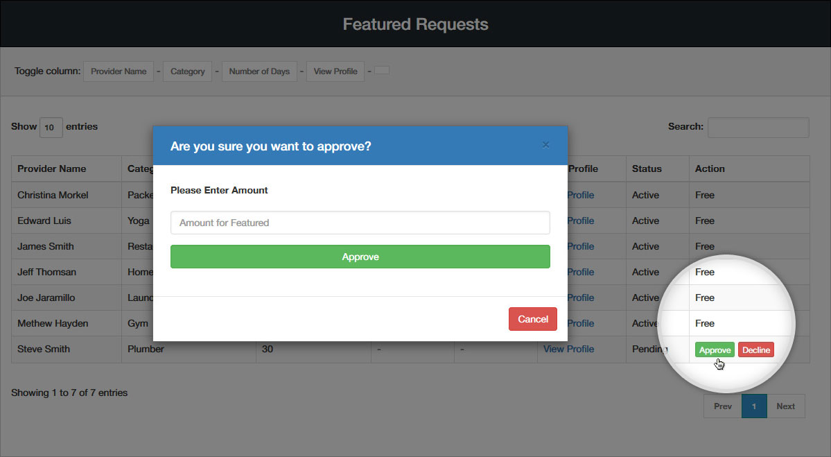 Provider can send request to admin to make them featured. Provider need to select desire number of days. Upon submission the request will be sent to admin and admin can find all requests here. Admin can reject the request or approve the request. While approving admin can define the price according to number of days requested and notification will be sent to provider to make the payment in order to get featured.