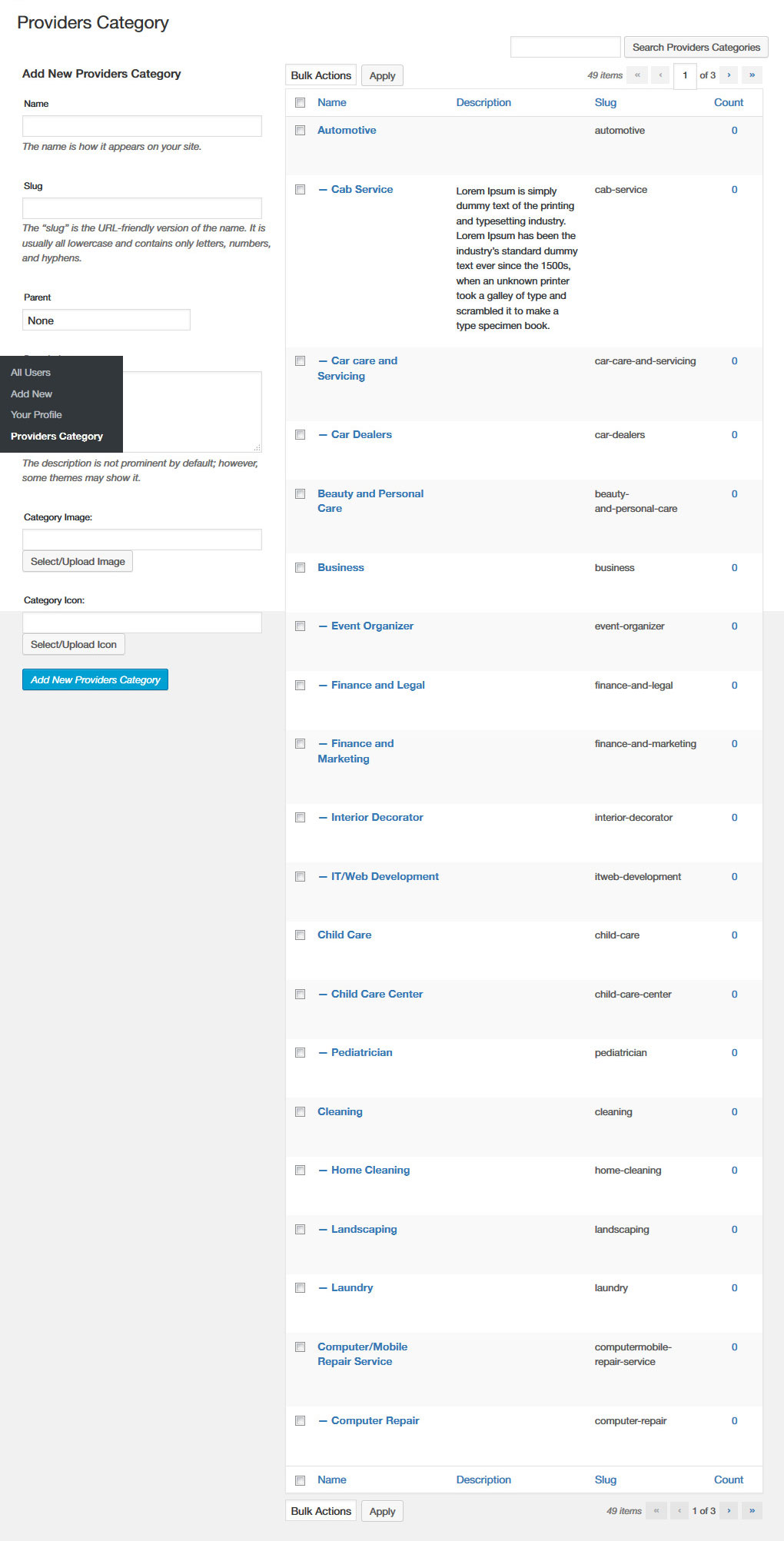 Admin can create providers categories from here. Admin can upload category image and category icon/marker from here.