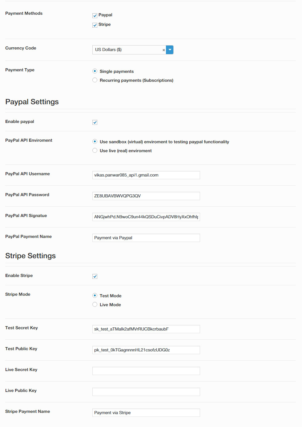 Admin can enter the PayPal and Stripe payment account settings from here. Admin can also select the live or test mode from here.